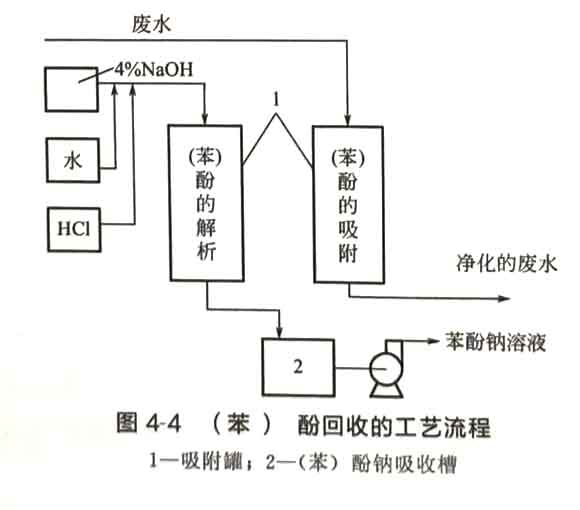 图4-4是以NaOH为再生剂,对吸附酚类有机物达饱和的活性炭进行再生处理的过程示意[47]。在(美国)米德兰的 Dow 化学公司的工厂里生产(苯)酚,所产生的废水经由由4台装炭(重13.6t)的吸附器组成的系统进行处理吸附器串联连续工作,两年里进行了一百多个吸附-解吸循环。