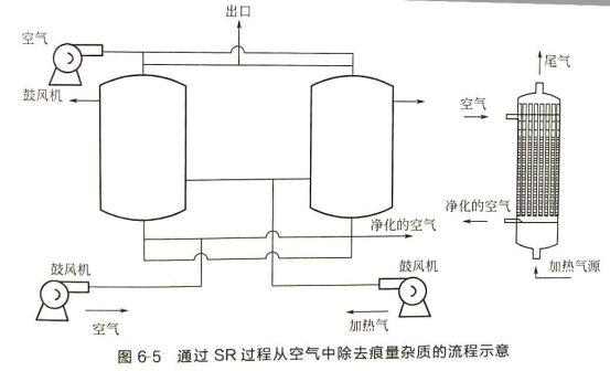 通常,空气中痕量烃杂质经加热或催化燃烧方法氧化为CO2和H2O而除去,这需要大量的燃料。通过吸附-反应(SR)循环过程可使净化空气所需的能量大幅度地降低。图6-5给出了这一流程的示意图。该体系包括两个平行的吸附柱,内部填充经物理混合的活性炭与氧化性催化剂,吸附柱含有列管换热器,从而吸附剂-催化剂混合物可被间接加热。典型的SR循环包括:1室温下活性炭吸附痕量烃直至杂质穿透为止,2通过间接或直接加热吸附剂-催化剂混合物到423K对烃进行在位氧化,3对吸附剂-催化剂混合物进行直接或间接冷却至室温,并排出燃烧产物。仅对吸附容器和它的内部物质加热至反应温度,就可使脱除和降解烃所需的能量大幅度降低。